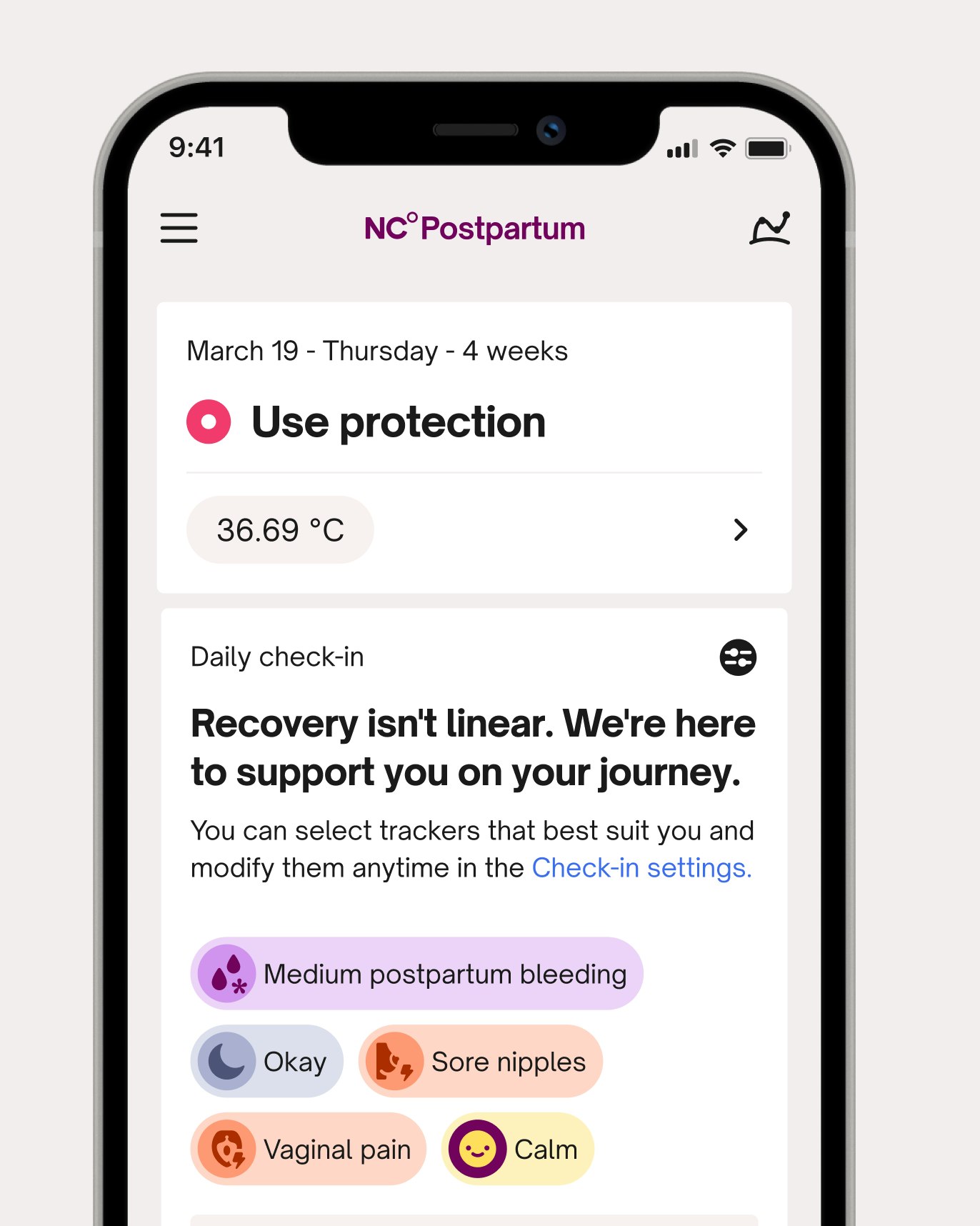 Everyone’s recovery journey is different. NC° Postpartum helps you track how you’re feeling and offers educational resources so you feel prepared and in control every day.